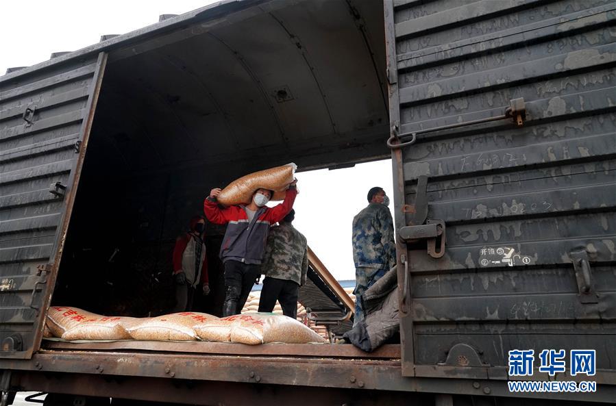 2月13日,在中国铁路郑州局集团有限公司开封车站,工作人员装运春耕物资。 眼下正值春耕备耕时节,中国铁路郑州局集团有限公司开封车站针对当前疫情防控重点,有序组织车站货运人员复工复产,并积极与地方企业对接,密切关注企业投产和运输需求,为春耕物资开辟绿色通道,全力确保运输秩序安全稳定。2月13日,该站发送化肥、种子等春耕物资33车1980吨。 新华社记者 李安 摄