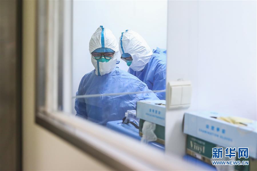 2月13日,庞振(右)为陈美茹扎紧防护服的衣带。新华社记者 张玉薇 摄