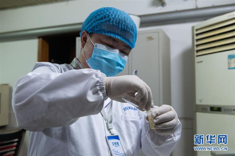 2月14日,在湖南常德甘露寺农贸市场食品安全检测室,检测员将浸泡蔬菜后的缓冲溶液倒入检测盒。 新华社发(陈思汗 摄)