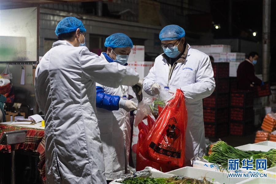 2月14日,检测员在湖南常德甘露寺农贸市场采集样品。 新华社发(陈思汗 摄)