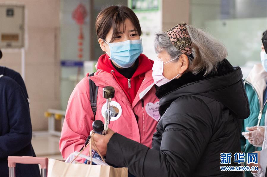 2月15日,在湖南省常德市第一人民医院,支援武汉医疗队队员(左)临行前与亲属道别。新华社发(陈思汗 摄)