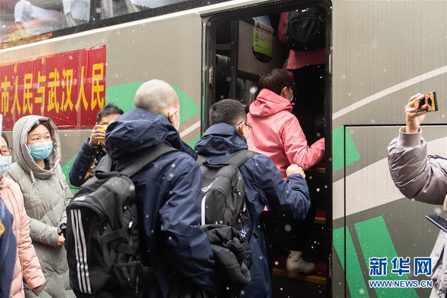2月15日,在湖南省常德市第一人民医院,支援武汉医疗队上车出发。新华社发(陈思汗 摄)