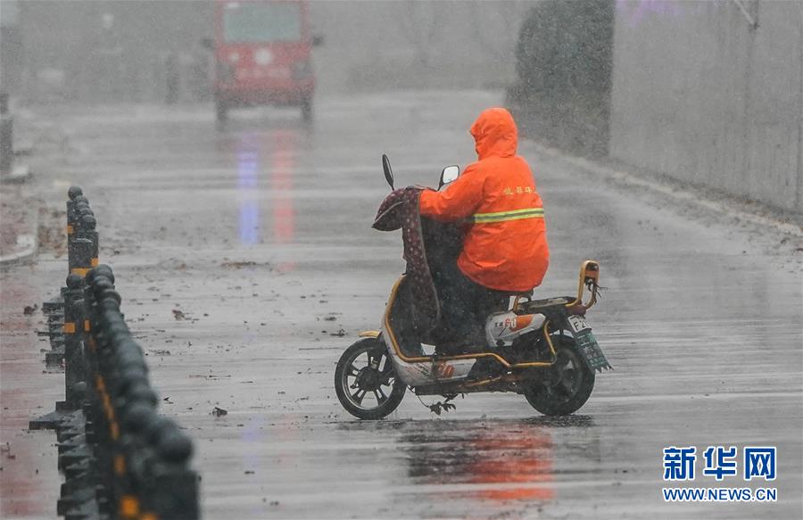 2月15日,一名环卫工人骑车驶过街道。新华社记者 程敏 摄