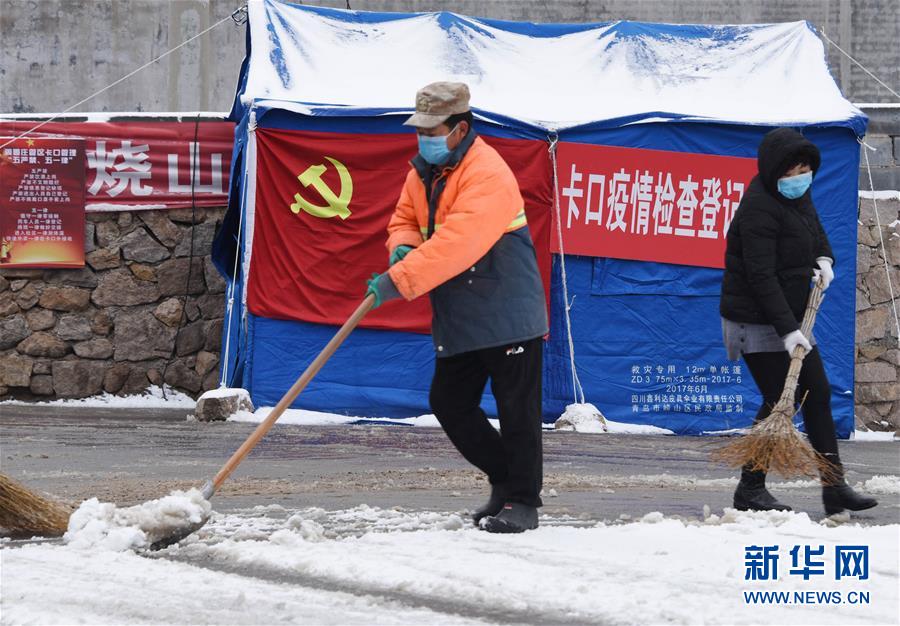 2月15日,在青岛市崂山区寨上村,检查点工作人员在清理积雪。 当日,青岛迎来降雪降温天气,防疫一线工作人员坚守岗位。 新华社记者李紫恒摄