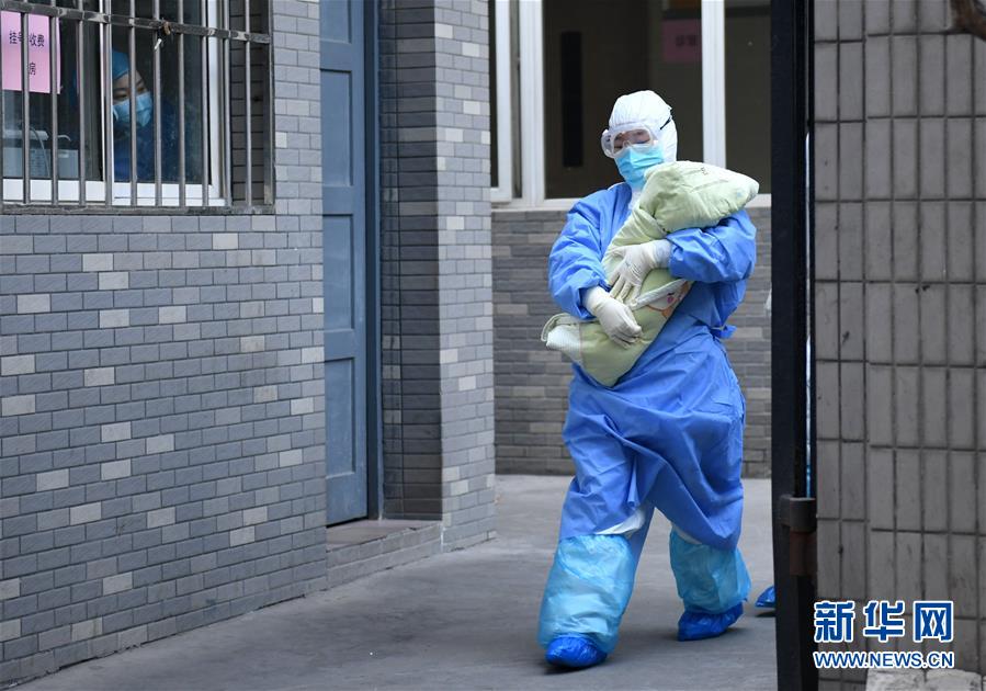 2月15日,在西安交通大学第二附属医院,医护人员怀抱陕西省首例新冠肺炎产妇诞下的健康新生儿走出医院,护送新生儿返乡。新华社记者 李一博 摄