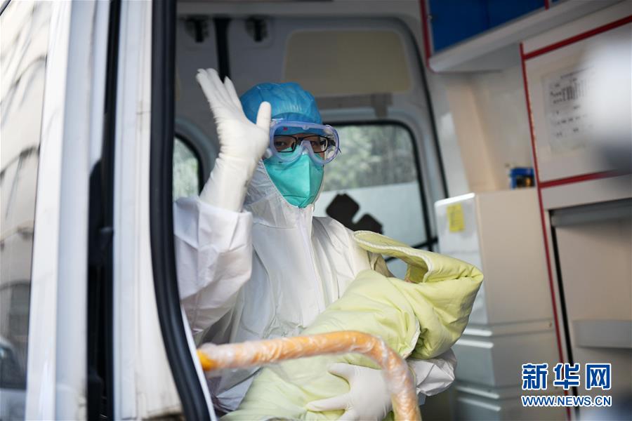 2月15日,在西安交通大学第二附属医院,医护人员怀抱陕西省首例新冠肺炎产妇诞下的健康新生儿登上救护车,护送新生儿返乡。新华社记者 李一博 摄