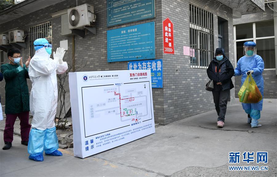 2月15日,在西安交通大学第二附属医院,医护人员欢送陕西省首例新冠肺炎产妇(右二)治愈出院。新华社记者 李一博 摄