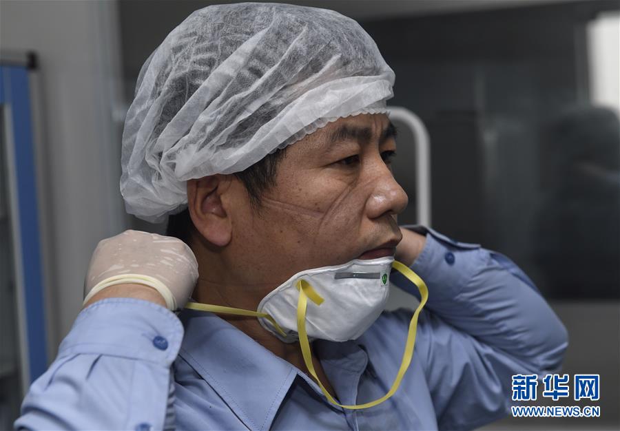 2月15日,四川国际旅行卫生保健中心(成都海关口岸门诊部)卫生检疫综合实验室检测人员完成检测工作后脱下口罩。新华社记者刘坤摄