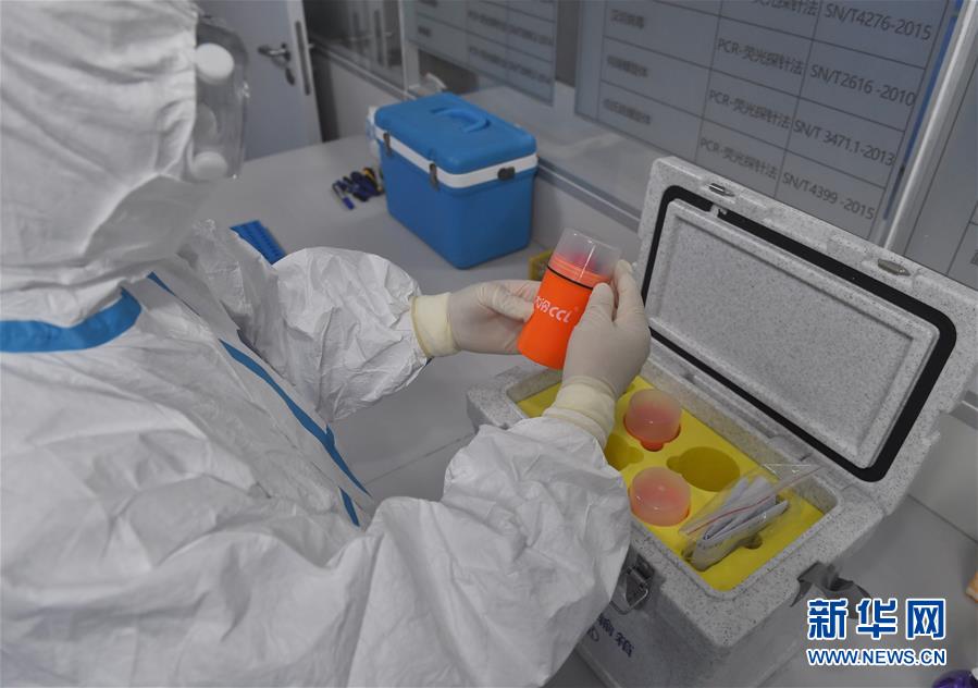 2月15日,四川国际旅行卫生保健中心(成都海关口岸门诊部)卫生检疫综合实验室检测人员从生物安全运输箱内取出检测样本。新华社记者刘坤摄