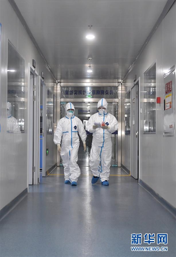 2月15日,四川国际旅行卫生保健中心(成都海关口岸门诊部)卫生检疫综合实验室检测人员将检测样本带入实验室。新华社记者刘坤摄