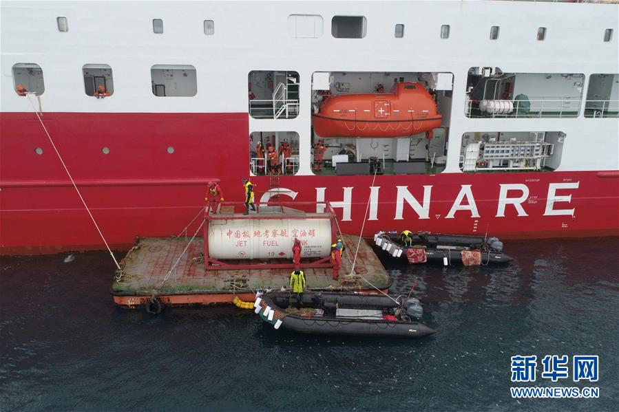 “雪龙2”号进行长城站最后一驳船站用燃油卸运(2月14日无人机照片)。 “雪龙2”号极地科考破冰船北京时间2月15日零时10分(当地时间14日12时10分)完成南极长城站卸货任务,离开长城站附近海域,驶向正在建设中的罗斯海新站。 新华社记者 刘诗平 摄