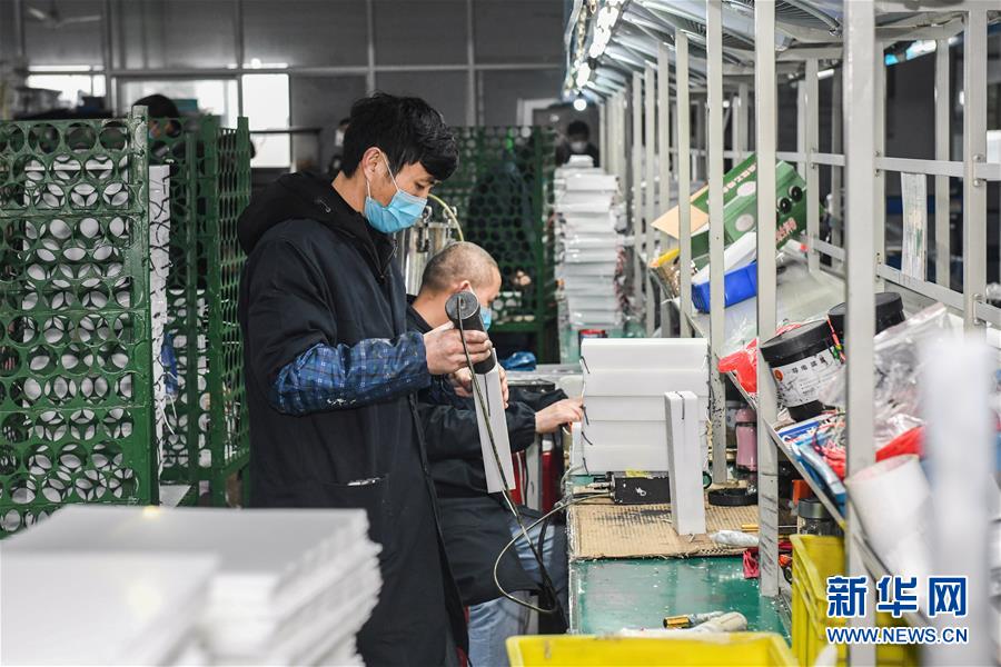 2月15日,慈溪市一家刚复工的企业员工在流水线上生产净化器的滤芯。新华社记者 徐昱 摄