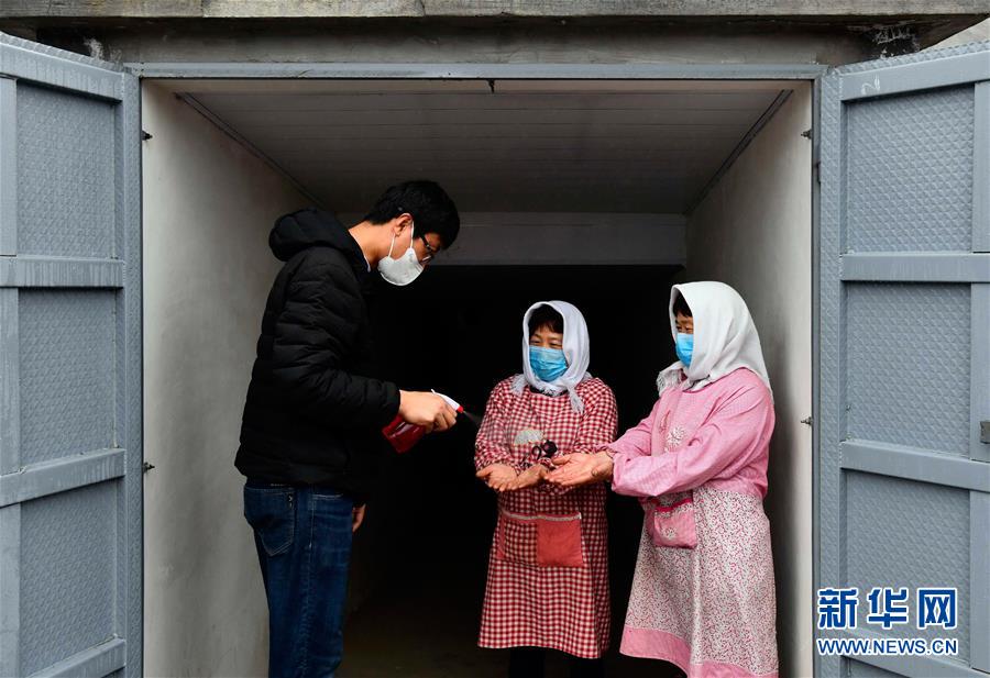 2月14日,在山东省潍坊市寒亭区国家现代农业产业园,潍坊郭牌农业公司工作人员进入温室大棚前接受手部消毒。新华社记者 郭绪雷 摄
