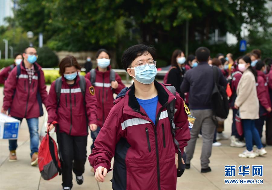 2月15日,驰援湖北的福建医护人员从福建会堂出发。新华社记者 林善传 摄