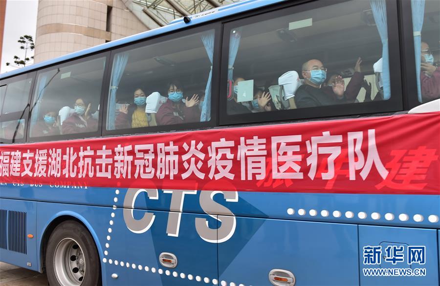 2月15日,福建医护人员从福建会堂出发,前往福州长乐国际机场驰援湖北。新华社记者 林善传 摄