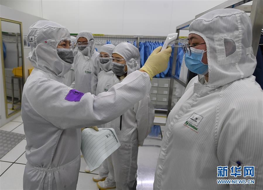 2月15日,在力特半导体(无锡)有限公司,员工在进入生产车间前测量体温。 为确保企业安全平稳有序开工,尽快恢复正常生产,江苏省无锡市成立企业复工复产工作协调小组,在确保疫情防控工作到位的前提下,从落实企业防疫物资、组织员工返锡返岗、保障生产要素供应等方面,加大工作力度、创新工作举措,为企业复工复产创造条件。截至2月13日,无锡市累计4386家规模以上工业企业复工,占全部规模以上工业企业数比重达到70.6%,复产也进入加速轨道。 新华社记者 季春鹏 摄