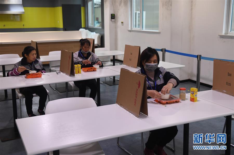2月15日,在力特半导体(无锡)有限公司,员工在食堂用餐。 为确保企业安全平稳有序开工,尽快恢复正常生产,江苏省无锡市成立企业复工复产工作协调小组,在确保疫情防控工作到位的前提下,从落实企业防疫物资、组织员工返锡返岗、保障生产要素供应等方面,加大工作力度、创新工作举措,为企业复工复产创造条件。截至2月13日,无锡市累计4386家规模以上工业企业复工,占全部规模以上工业企业数比重达到70.6%,复产也进入加速轨道。 新华社记者 季春鹏 摄