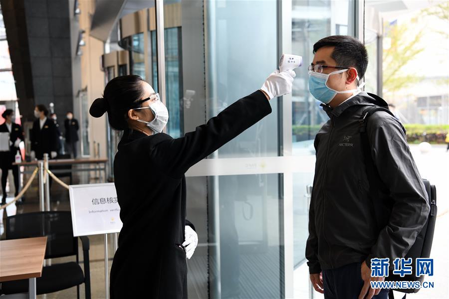 在位于深圳福田区CBD的平安金融中心,企业员工在进入写字楼前接受体温检测(2月10日摄)。新华社记者 梁旭 摄