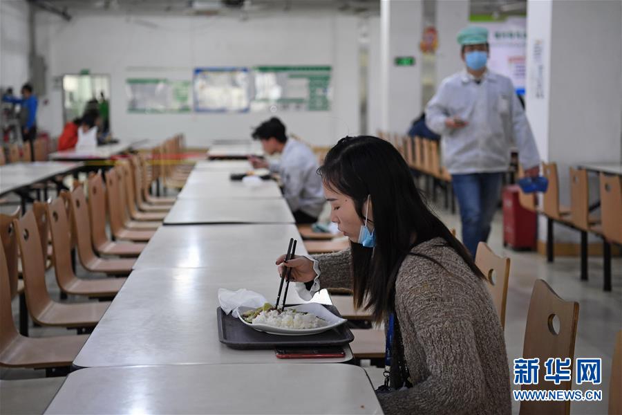 在位于龙岗区的深圳市海能达通信有限公司,工人在食堂按规定间隔就餐(2月10日摄)。新华社记者 梁旭 摄