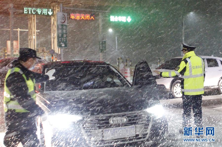2月15日晚,在S49新扬高速江苏盱眙收费站,防疫工作人员对入城车辆进行检查。 2月15日,江苏部分地区出现风雪天气。在道路各卡口、居民小区门口等地,公安、卫生、社区的防控工作人员冒着风雪坚守在防控疫情第一线,对进出车辆及人员进行排查、体温检测、信息登记,筑起防控疫情的坚实防线。 新华社发(颜怀峰 摄)