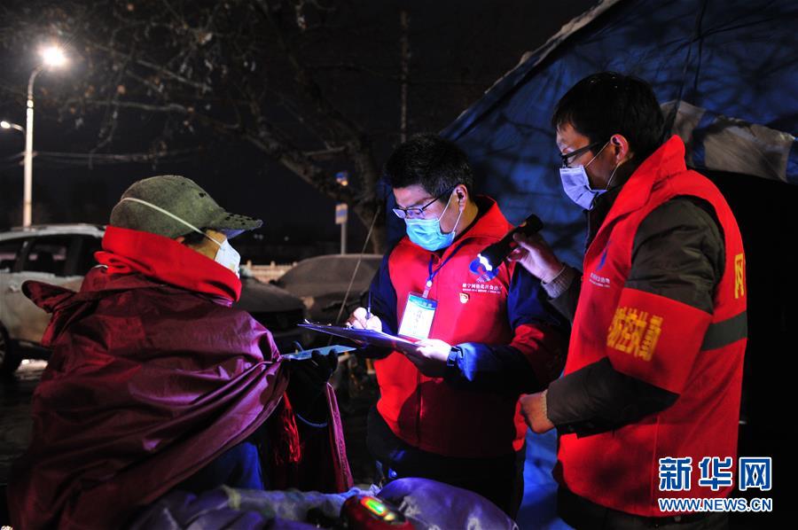 2月15日晚,徐州市睢宁县北陵社区疫情防控卡点的志愿者在值勤。 2月15日,江苏部分地区出现风雪天气。在道路各卡口、居民小区门口等地,公安、卫生、社区的防控工作人员冒着风雪坚守在防控疫情第一线,对进出车辆及人员进行排查、体温检测、信息登记,筑起防控疫情的坚实防线。 新华社发(洪星 摄)