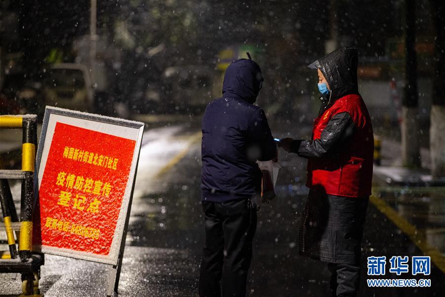 2月15日,在南京梅园新村街道北安门社区,工作人员为进出的居民测量体温。 2月15日,江苏部分地区出现风雪天气。在道路各卡口、居民小区门口等地,公安、卫生、社区的防控工作人员冒着风雪坚守在防控疫情第一线,对进出车辆及人员进行排查、体温检测、信息登记,筑起防控疫情的坚实防线。 新华社发(苏阳 摄)