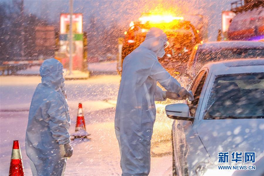 2月15日晚,在G15高速公路连云港市赣榆收费站,防疫人员冒雪对入城车辆的司乘人员进行体温测量。 2月15日,江苏部分地区出现风雪天气。在道路各卡口、居民小区门口等地,公安、卫生、社区的防控工作人员冒着风雪坚守在防控疫情第一线,对进出车辆及人员进行排查、体温检测、信息登记,筑起防控疫情的坚实防线。 新华社发(司伟 摄)