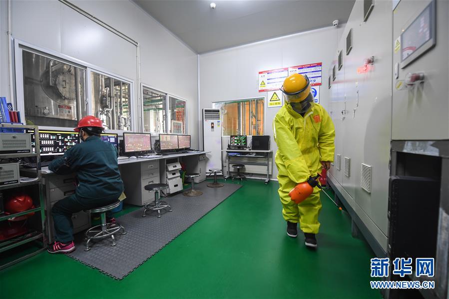 2月16日,在位于杭州市余杭区塘栖镇的杭州宝晶生物股份有限公司内,工作人员在控制室内进行日常消杀工作。该公司是一家高科技生物化工企业,产品以外贸为主,当地政府工作人员通过上门对接的方式积极帮助企业复工生产。 近期,浙江省杭州市余杭区塘栖镇在防控新冠肺炎疫情的同时,积极深化“三服务”工作,推出专员上门服务机制、企业“白名单”诚信档案、企业内控监测流程、住地房东协管承诺、突发情况应急预案等多项配套机制,帮助企业做好疫情防控,协调物流、交通等企业需要解决的问题,精准服务企业复工复产。截至2月15日,塘栖镇累计申报复工复产规上工业企业81家,目前已全部通过网上审批。 新华社记者 徐昱 摄