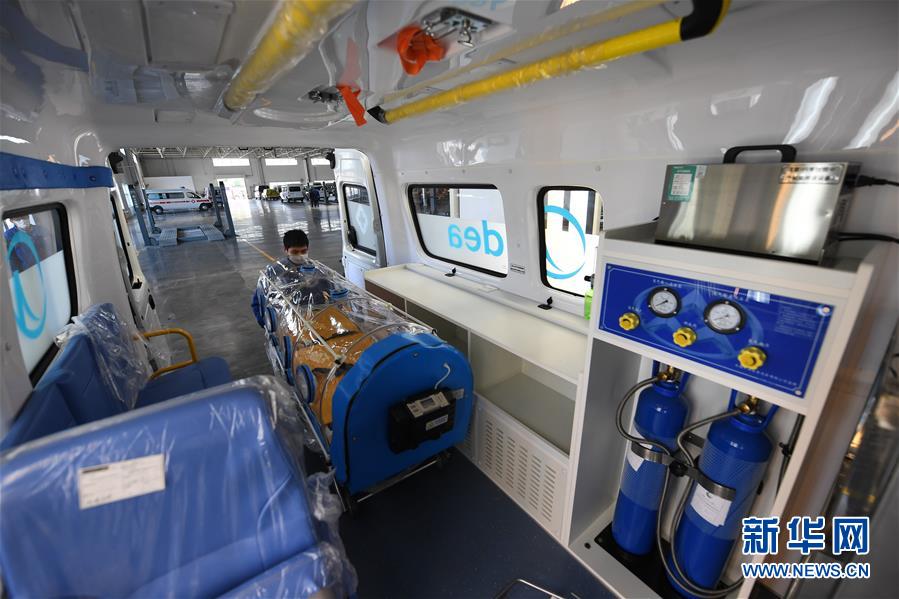 2月16日,在上汽大通汽车有限公司无锡分公司改装车间,工作人员将专用隔离舱装进负压救护车。 为助力新冠肺炎疫情防控,上汽大通汽车有限公司从除夕夜接到生产任务后,连续加班生产负压救护车。目前,已有104辆负压救护车交付湖北抗疫一线使用,还有60辆正在改装中,不日也将开赴湖北。 新华社记者 季春鹏 摄