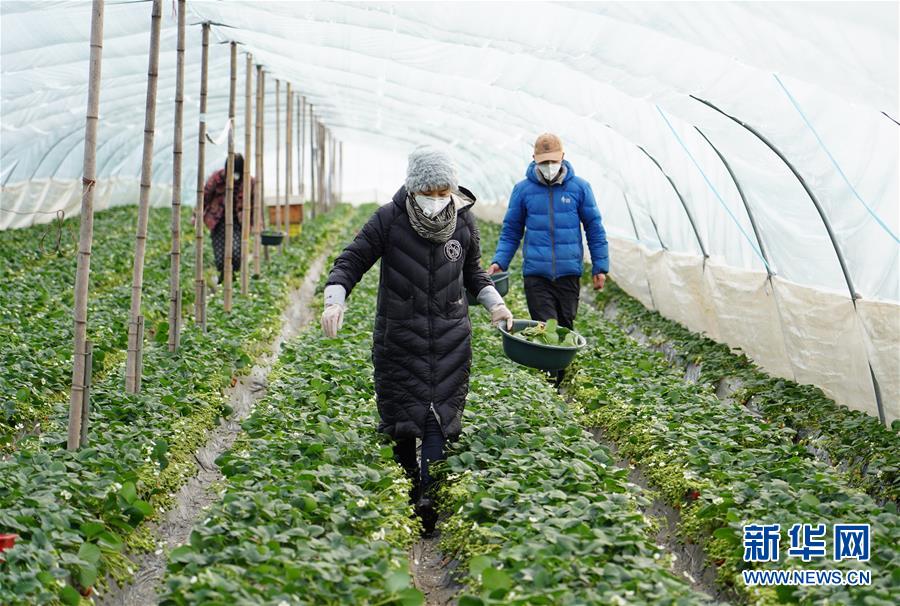 2月15日,西安市长安区果优特种植专业合作社负责人王卫花(中)与社员在草莓大棚中疏叶。 春耕时节,陕西省西安市长安区的农民在做好疫情防控的同时,紧抓农时,积极开展春耕生产。 新华社记者 邵瑞 摄