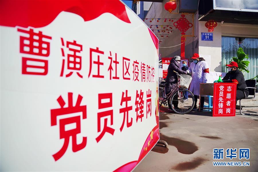 2月16日,党员王东海(右二)在桥西区曹演庄社区疫情防控检查点为居民测量体温。 近日,河北省邢台市桥西区在辖区设立579个“党员先锋岗”,充分发挥共产党员先锋模范作用。党员们在小区门口执勤,为来往居民测量体温,宣传防疫知识。 新华社记者 杨世尧 摄