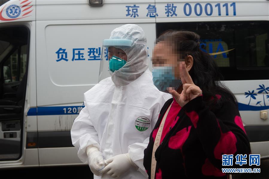 2月16日,一名出院患者在海南省人民医院与救护车司机合影。 当日,在海南省人民医院,12名新冠病毒肺炎确诊患者经过医院系统诊治后,痊愈出院。 新华社发 (张丽芸 摄)
