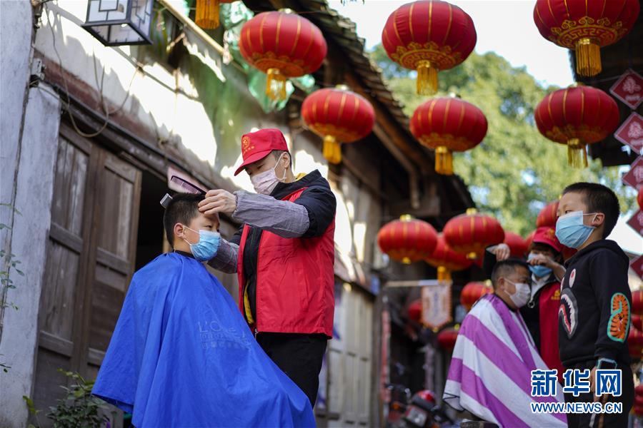 2月16日,社区志愿者理发服务队队员陈一波(左二)给社区的一名小男孩理发。 近期,由于疫情防控需要,许多理发店暂停营业。重庆市北碚区金刀峡镇偏岩社区的社区工作者组织了一支志愿者理发服务队,深入社区提供免费理发服务,受到群众的欢迎。 新华社记者 刘潺 摄