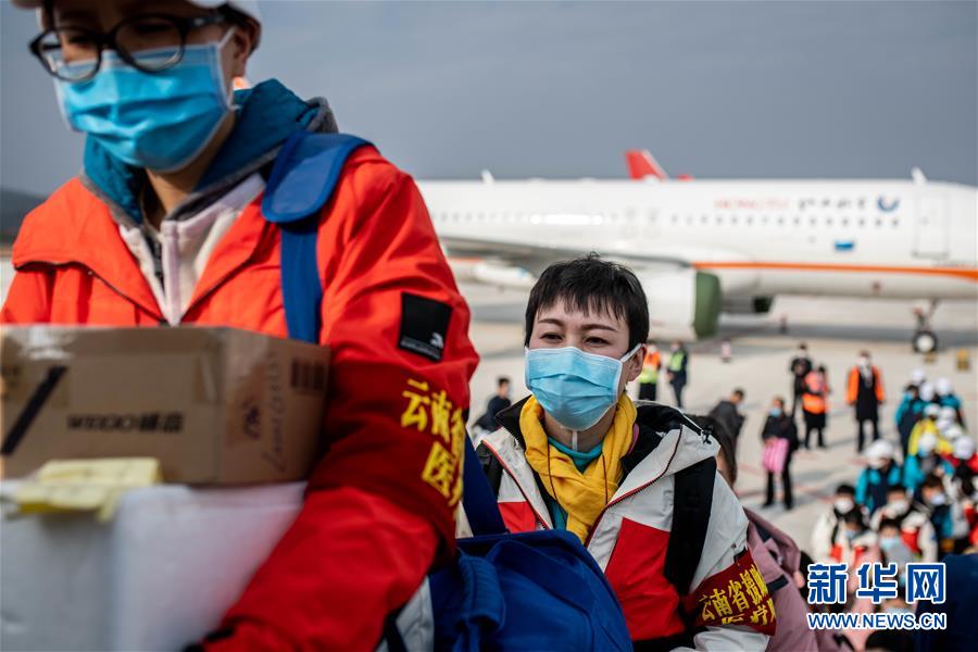 2月16日,云南第五批援助湖北医疗队队员在昆明长水国际机场登机出发。 当日,由108名医护人员组成的云南第五批援助湖北医疗队奔赴武汉。据了解,这批医疗队成员来自云南省中西医结合医院、曲靖市第一人民医院等省内20多家医疗机构。截至目前,云南已向湖北派出援助医疗队员809名。 新华社记者胡超 摄