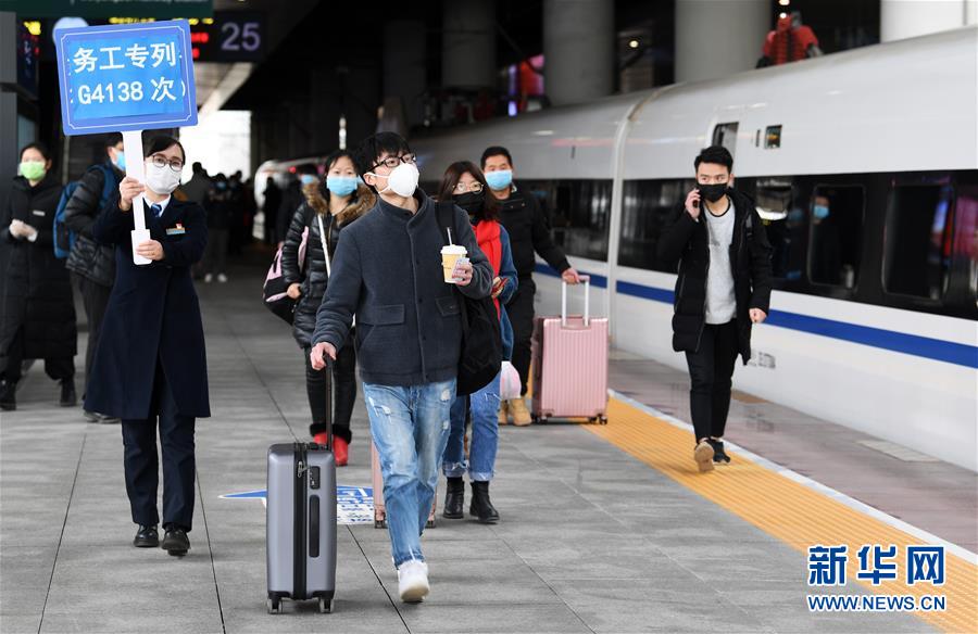 2月16日,工作人员在贵阳北站引导返程务工人员上车。 当日,全国铁路定制务工人员返程专列从贵阳北站开出,近300名贵州籍务工人员乘车前往杭州市。 据悉,在全力防控新冠肺炎疫情的同时,各地企业也在逐渐复工复产。为了既满足企业用工需求,又降低返程运输的疫情传播风险,浙江省杭州市对疫情相对平稳,前往杭州就业人员较为集中的贵州、四川等部分省市申请开行外地务工人员“一站式”抵达专列。乘客进站统一测量体温、列车上“隔排隔座”,保证人员安全。 新华社记者 杨文斌 摄