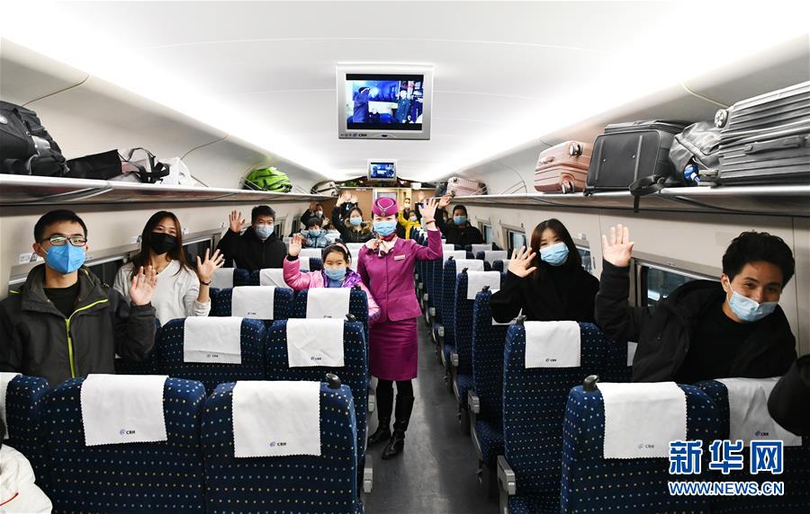 2月16日,务工人员与列车员在G4138次返程专列上合影。 当日,全国铁路定制务工人员返程专列从贵阳北站开出,近300名贵州籍务工人员乘车前往杭州市。 据悉,在全力防控新冠肺炎疫情的同时,各地企业也在逐渐复工复产。为了既满足企业用工需求,又降低返程运输的疫情传播风险,浙江省杭州市对疫情相对平稳,前往杭州就业人员较为集中的贵州、四川等部分省市申请开行外地务工人员“一站式”抵达专列。乘客进站统一测量体温、列车上“隔排隔座”,保证人员安全。 新华社记者 杨文斌 摄