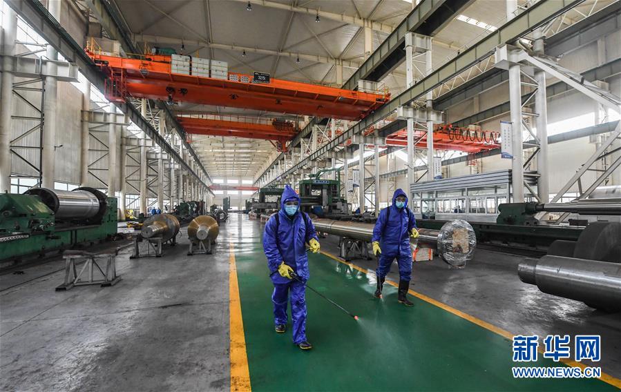 2月16日,在位于杭州市余杭区塘栖镇的宝鼎科技股份有限公司内,工作人员在车间进行消杀作业。该企业是从事各类大型铸锻件产品研发、生产和销售的高技术企业,目前大部分员工都已经到岗进行生产作业。 近期,浙江省杭州市余杭区塘栖镇在防控新冠肺炎疫情的同时,积极深化“三服务”工作,推出专员上门服务机制、企业“白名单”诚信档案、企业内控监测流程、住地房东协管承诺、突发情况应急预案等多项配套机制,帮助企业做好疫情防控,协调物流、交通等企业需要解决的问题,精准服务企业复工复产。截至2月15日,塘栖镇累计申报复工复产规上工业企业81家,目前已全部通过网上审批。 新华社记者 徐昱 摄