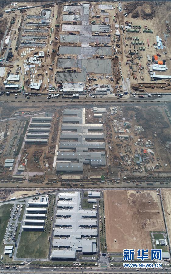 这是一张拼版照片:上图,2月3日,西安市公共卫生中心项目开工建设(无人机照片);中图,2月11日拍摄的一期主体完工的西安市公共卫生中心项目(无人机照片);下图,2月17日拍摄的正式交付使用的西安市公共卫生中心(应急院区)(无人机照片)。新华社记者 邵瑞 摄