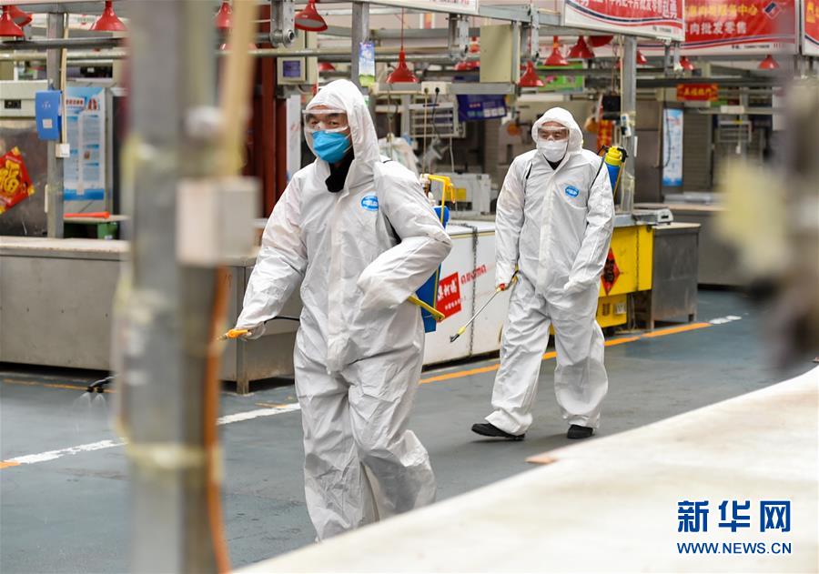 2月17日,内蒙古呼和浩特市回民区市场监督管理局组织人员对万惠农贸批发市场肉食品销售区域进行定时消毒。 在新冠肺炎疫情防控过程中,内蒙古呼和浩特市回民区市场监督管理局加大对农贸市场的监督管理力度,在辖区内的大型农贸市场设立流动检查岗,组织人员对市场进行定时消毒,并实时调查各类食品的价格和供应情况,严厉打击疫情期间哄抬物价、囤积居奇等违法违规行为。 新华社记者 彭源 摄