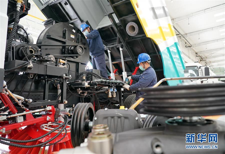 2月17日,石家庄市冀中装备集团石煤机公司的工人在环卫车生产线上工作。新华社记者 杨世尧 摄