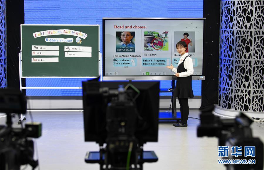 2月17日,宁夏银川市金凤区实验小学教师杨玉燕在录制“空中课堂”四年级英语课程。新华社记者 冯开华 摄