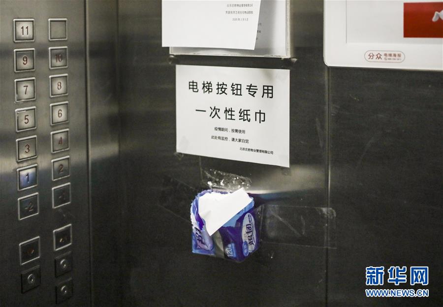 2月17日,北京某小区居民楼电梯内,社区为居民准备了按电梯按钮的纸巾。新华社记者 兰红光 摄