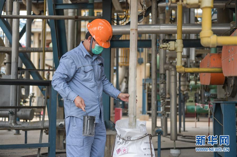 2月17日,中国石化海南炼化公司工人在取样检测聚丙烯PPH-Y40质量。新华社发(蒲晓旭摄)