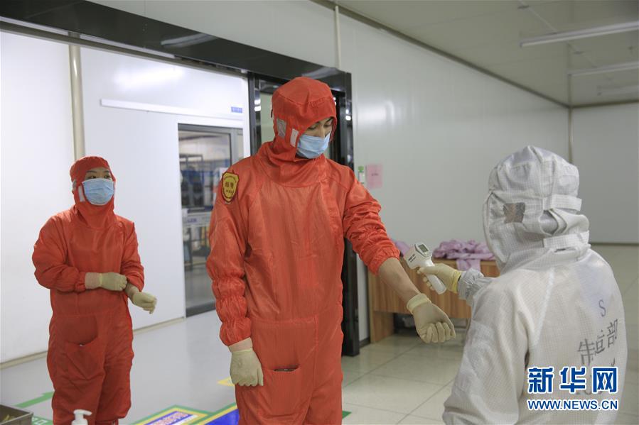 2月17日,在重庆市北碚区一家生产手机配件的企业,员工进入生产车间时测量体温。新华社发(秦廷富 摄)