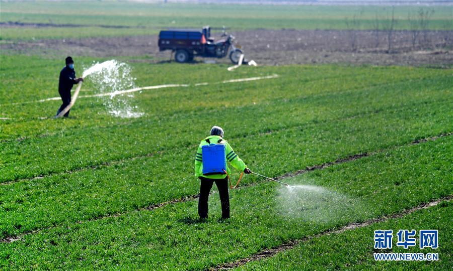 2月18日,渭南市华州区瓜坡镇北沙村村民在田间为返青的小麦灌水与防病。新华社记者 陶明 摄