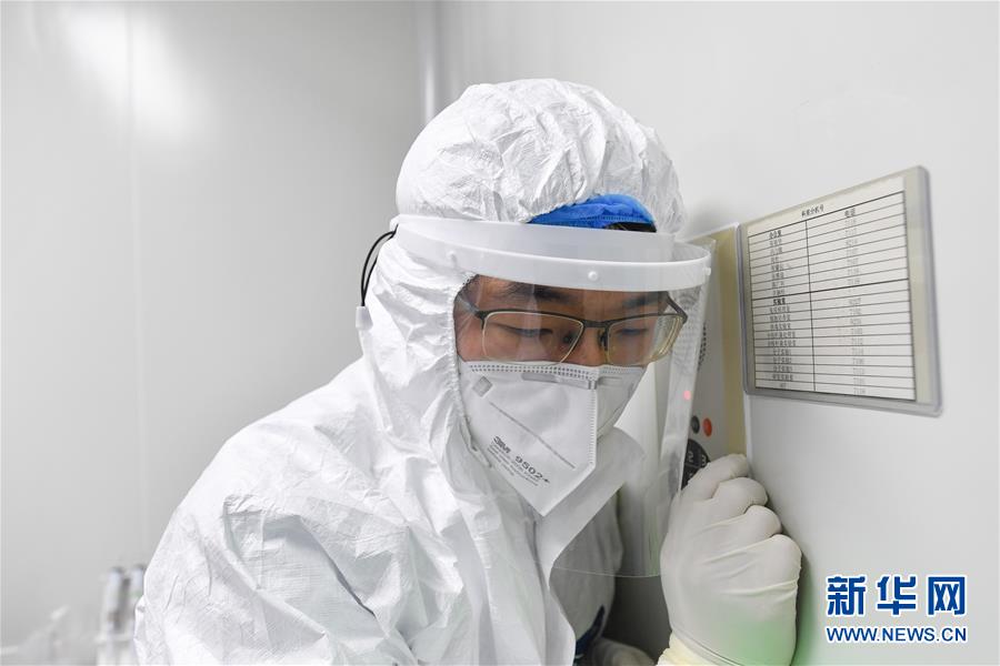 冯力敏在病毒诊断与转化中心实验室通过内线电话和其他小组同事联系(2月18日摄)。 新华社记者 刘大伟 摄