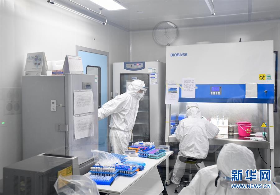 冯力敏(左)和他的小组成员在病毒诊断与转化中心实验室忙碌(2月18日摄)。 新华社记者 刘大伟 摄