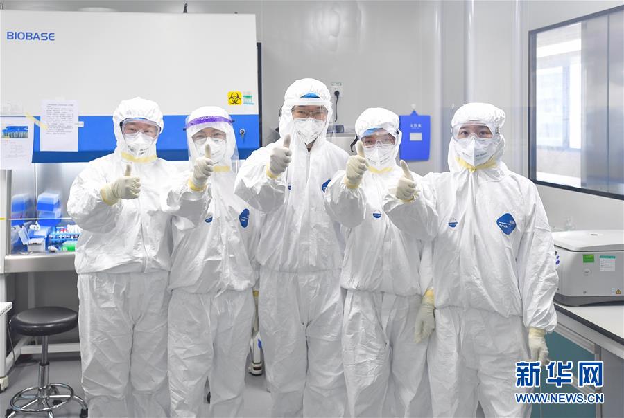 冯力敏(中)和他的小组成员在病毒诊断与转化中心实验室(2月18日摄)。 新华社记者 刘大伟 摄