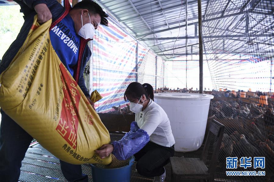 广西大化瑶族自治县七百弄乡弄腾村养殖专业合作社负责人韦中江(左)与妻子一起配制养殖饲料(2月17日摄)。新华社记者 曹祎铭 摄