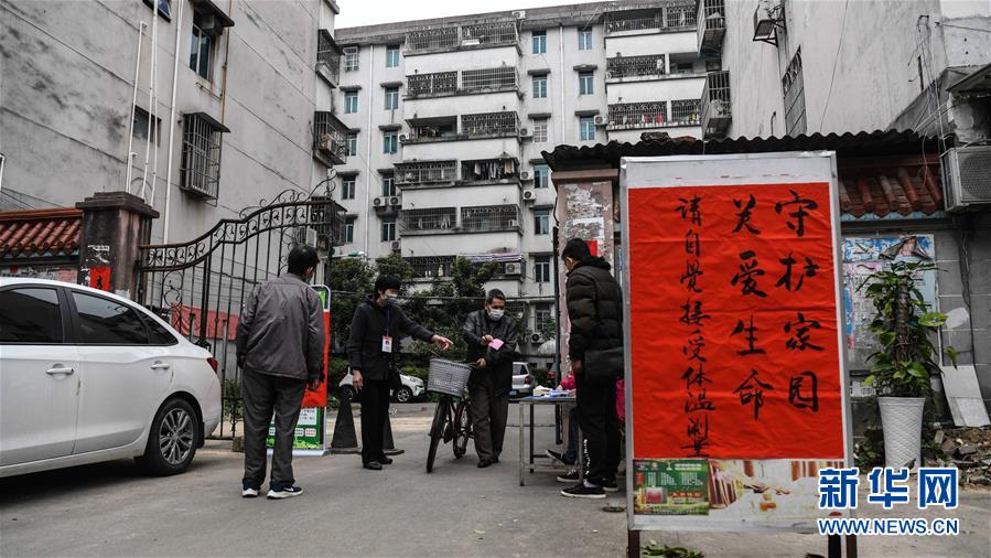 2月19日,广西钦州市钦南区向阳街道办事处工作人员在鸿福小区门前进行疫情防控工作。新华社记者 张爱林 摄
